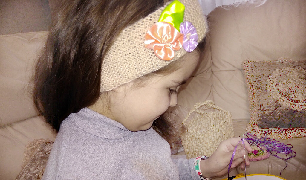 Маленькие воображульки всегда хотят чего-то нового. Причем для счастья им нужно совсем не много. В этот раз побаловала ее необычной головной повязкой. Сначала планировали надеть ее на праздничный утренник, но разве можно удержаться и не примерить? А примерили и …. На праздник будем делать другую. Как это было? 1. Связала повязку из ниток, которые оказались под рукой. Обычной платочной вязкой. Можно взять кусок плотной однотонной ткани и сшить повязку из нее. 2. Взяла бутоньерку, которую сделала вчера из атласных лент за 10 минут, и подобрала еще одну подходящую по цвету к повязке и бутоньерке ленту. 3. Сделала еще один простой цветок по типу «труба»: 4. Прикрепила цветок к бутоньерке. 5. Пришила букетик к повязке. За вечер сделать такой подарочек совсем несложно. Заразителен не только дурной пример. Внучка вдохновилась моим творчеством, расспросила про мой вышивальный план, рассмотрела готовые картины и попросила иголку и ленточку. Для самого главного подарка – маме. Спасибо, ч
