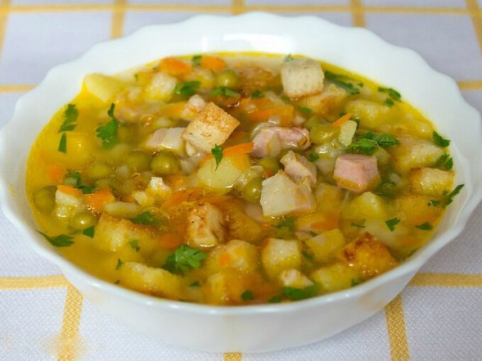 Гороховый суп - одно из самых любимых блюд всех детей. Но что вкус первого блюда был действительно незабываемым добавьте среди прочих ингредиентов копченую свиную грудинку. Ингредиенты Способ приготовления Как и с чем подавать Готовый суп подавать, посыпав жареной грудинкой и рубленой зеленью. Приятного аппетита!