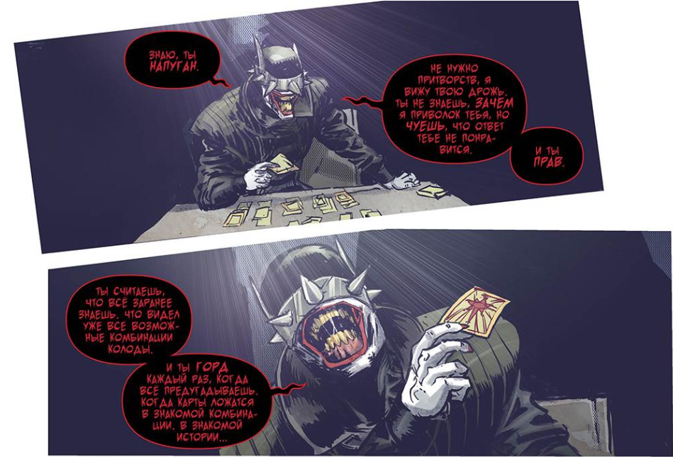 Этой картой является Джокер. Таким образом, Бэтмен,который смеётся, намекает нам, что Мистер Джей своим появлением изменил не только саму игру ,но и саму суть игры. Земля 22 Готэм-сити в очередной раз становится полем боя. Джокер собирается уничтожить город темного рыцаря. Он использует против Бэтмен вещество, которое лишает того сил. Безумец связывает защитника Готэма и заставляет Брюса наблюдать за тем, как Готэм утопает в крови. Из слов Джокера мы узнаем, что с полицией было покончено. Гордон убит, многие преступники Готэма также мёртвы. Чтобы заставить Бэтмана ещё больше корчиться от боли, Джокер проигрывает перед глазами Брюса вот такую картину. "Что же тут у нас? Молодая семья возвращается прямиком из кинотеатра, а я знаю, что будет дальше." Перед глазами Бэтса промелькнула эпизод, который напомнил ему о трагедии. Он вспомнил, как потерял родителей, а Джокер продолжал издеваться. Он говорил девочке, что теперь она не нуждается в родителях, что теперь она стала первым