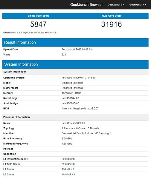 Выход мобильных процессоров AMD Ryzen 4000 сильно ударил по амбициям компании Intel, которая впервые за очень продолжительный срок получила настоящего конкурента в этом сегменте рынка. И она торопится представить процессоры Comet Lake-H. Мы уже писали об Intel Core i7-10750H, который недавно засветился в Сети, когда стало известно, что он установлен в игровом ноутбуке MSI GP75-10SEK. А сейчас в базе данных Geekbench обнаружились результаты тестирования Intel Core i9-10880H. Этот чип - преемник Intel Core i9-9880H. Его базовая частота - 2,3 ГГц, максимальная - 4,88 ГГц. Это, как и в случае с Intel Core i7-10750H, подтверждает, что Intel пошла по пути увеличения частоты, а не количества ядер. Об этом же свидетельствует рекламная кампания, обещающая преодоление планки в 5 ГГц. Однако существенного прироста производительности такое решение не даст. Опираясь на результаты, полученные в тесте Geekbench, приходим к выводу, что новый Intel Core i9 обходит своего предшественника всего на 10%. П