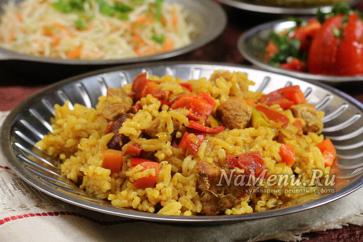 Ингредиенты: 🥩Свинину режем кусочками, сало - тонкими пластинами. Половину сала выкладываем на горячую сковороду, вытапливаем жир, кладем мясо, обжариваем со всех сторон 💦Шкварки вынимаем. В сковородку наливаем полстакана воды, даем закипеть. Под крышкой тушим мясо 15-20 минут 🧅Отдельно обжарим овощи на оставшимся сале: сначала лук, затем добавляем нарезанный кубиком перец и морковь 🍅Добавим куркуму, паприку и перец. Помидоры нарежем кусочками, смешаем с овощами 🍚Через 5 минут, добавим промытый рис. Смешаем с овощами, прогреем, помешивая, добавим мясо, снова перемешаем 🔥Заливаем водой и томим под крышкой 30-40 минут https://namenu.ru/11659/Ris_s_myasom_na_skovorode__ne_suhoj/