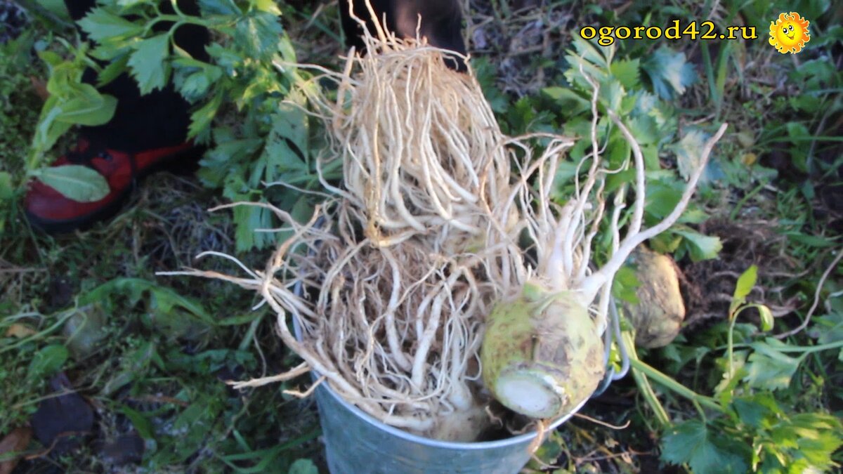 Урожай приятно держать в руках: крупные круглые корнеплоды. Зеленый хвост листьев обрезаю, их хорошо сушить – они имеют характерный, приятный запах, и некоторые авторы советуют сушеные листья сельдерея использовать зимой вместо петрушки, листья которой после сушки пахнут слабо. Корнеплоды хранятся хорошо, как картофель, их не едят мыши. При уборке не нужно обрезать корни, так как легко занести гнили. Лучше промыть струей воды, высушить и заложить на хранение.