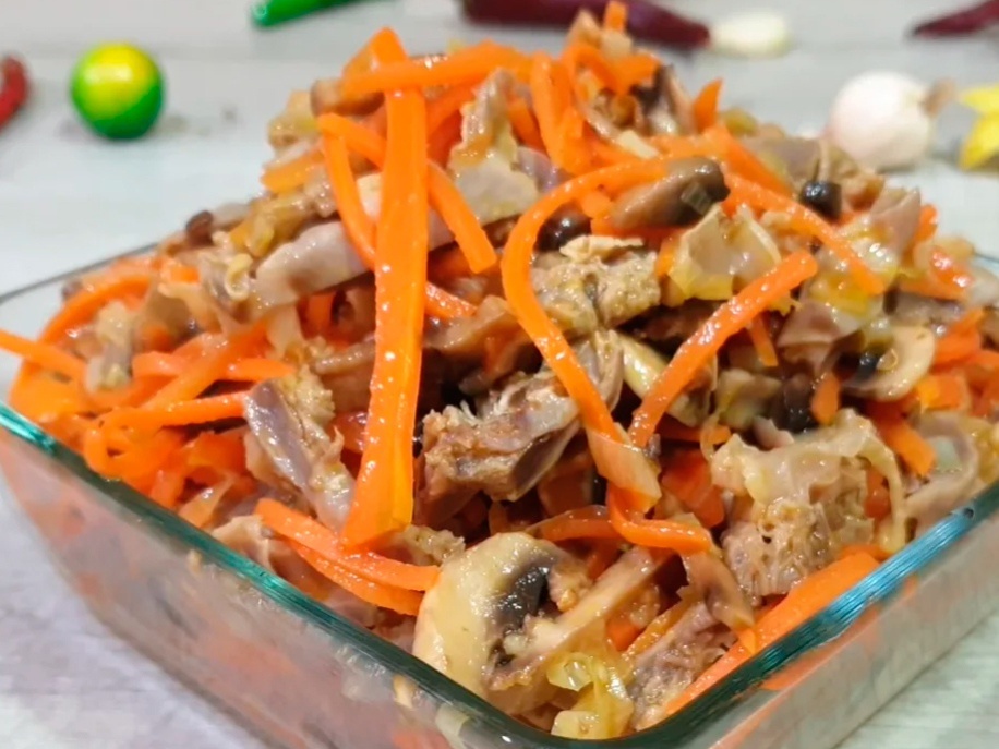 3.Обжариваю каждый ингредиент по отдельности на растительном масле. Сначала грибы, потом желудки и в конце лук с морковью, перемешиваю всё вместе, добавляю молотый кориандр (можно заменить приправой для корейской моркови) и занимаюсь заправкой.