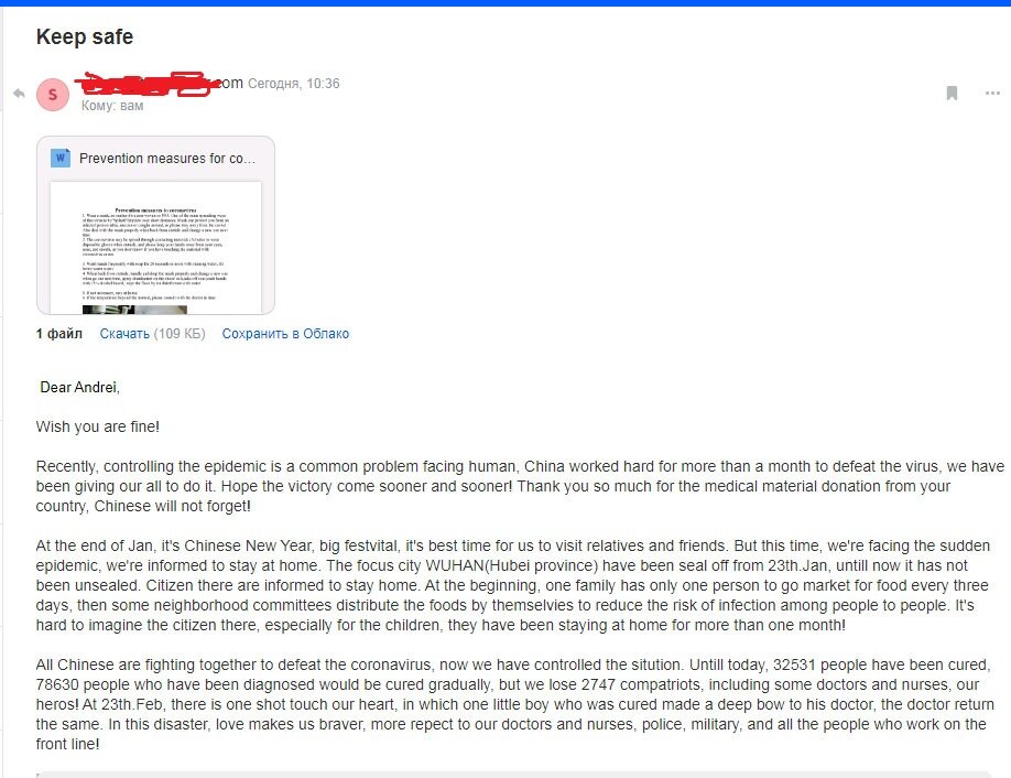 Сегодня пришло письмо от китайского друга Пишет как трудно побороть вирус, что вся страна прилагает большие усилия чтобы вирус не распространялся дальше. Выражает огромную благодарность России за гуманитарную медицинскую помощь. Говорит что в каждой семье был человек, который ходил за продуктами, а остальные сидели дома. Ситуация взята под контроль - вылечено 32531, 78630 с подтвержденным диагнозом, а 2747 умерли, в том числе врачи и медсестры. 23 февраля в Китае всех растрогала фотография с вылеченным мальчиком, который кланяется врачу и врач ему ответил тем же. Сейчас число зараженных резко снижается. Многие фабрики возобновляют работу. В письме делится профилактическими мерами для борьбы с короновирусом. Prevention measures to coronavirus 1. Wear a mask, no matter it's a non-woven or N95. One of the main spreading ways of this virus is by “splash”droplets over short distances. Mask can protect you from an infected person talks, sneezes or coughs around, so please stay away from t