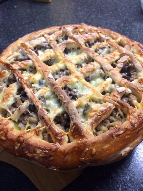 Готовим сытный пирог с мясом и картофелем. Для начала замешиваем дрожжевое тесто: в теплое молоко (2/3 стакана) добавляем муку, соль, сахар, дрожжи. консистенция густой сметаны, накрываем полотенцем и убираем в тёплое место, пока не поднимется (1,5-2 часа). Добавляем муку и обминаем, оставляем минут на 10. Картофель нарезаем пластинами, солим, фарш слегка обжариваем с солью и луком. Складываем пирог: тесто, картофель, фарш, грибы маринованные. Оставляем на расстойку- 20 минут. Выпекать 40 минут при 180 градусах. На самом деле это выпендрёж, пирог с мясом и картофелем делается закрытым! Всем хорошего настроения!