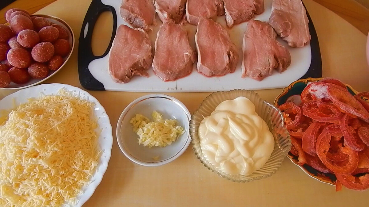 Всем привет. Сегодня вашему вниманию снова "Мужская еда", это мясо по-королевски. Нам потребуется: само мясо. Это отбивные, или антрекот, можно использовать корейку с косточкой. Также перец красный, помидоры чери, сыр пармезан, чеснок, майонез, лук, грибы шампиньоны или вешенки. Мясо отбиваем, солим, перчим и выкладываем на смазанный противень. Смазываем майонезом перемешанным с чесноком. Выкладываем лук обжаренный с грибами. И добавляем смесь итальянских трав. Дальше идет перец красный, порезанный кольцами. Добавляем ко всему этому помидорки чери, порезанные пополам. Все это покрываем майонезом (сеточкой), еще раз солим, перчим и обильно посыпаем натертым сыром. Отправляем в духовку на 30-35 минут при температуре 180 градусов. Наслаждаемся прекрасным блюдом. На последок видео моего любимого блюда на углях: "Мясо в Мясе"