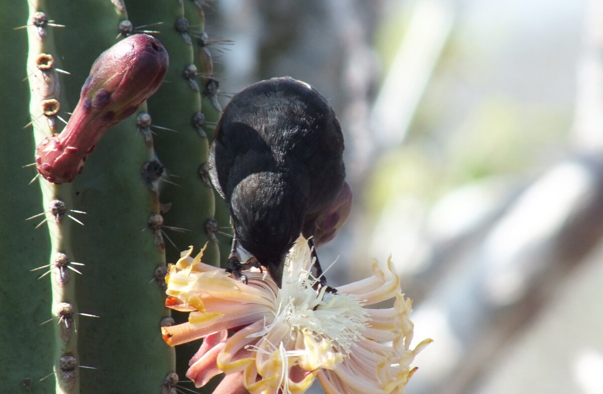 Галапагосские острова. Какие там шикарные цветущие кактусы! Цветы понравились не только мне. Маленькая птичка что-то делает на цветке кактуса. Она ест цветок кактуса? Кактусы там, как деревья! Особенно, опунция! Цветок опунции. Вот к нему летит какое-то насекомое. То ли пчела, то ли шмель. От цветов остаются шишечки. На желуди похожи :) Красота! :)