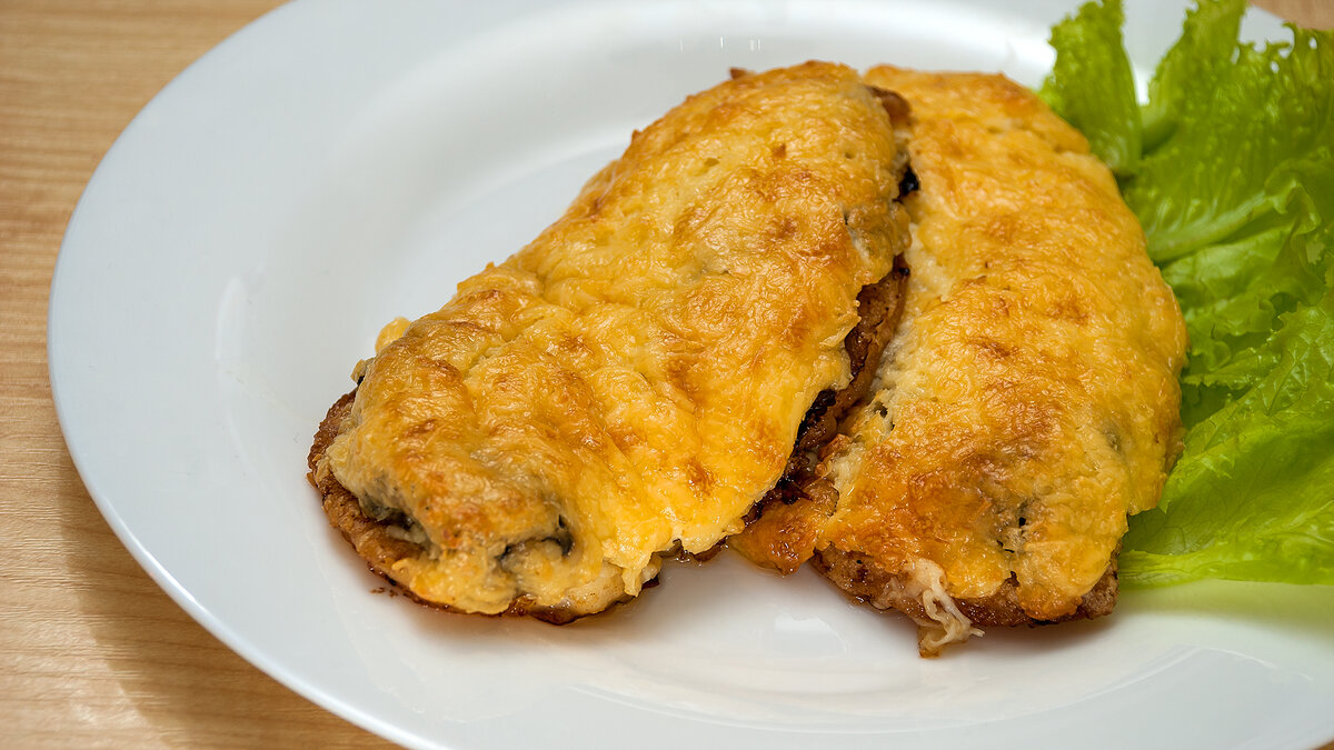 8. Теперь формируем наше мясо. В форму для запекания выкладываем обжаренное куриное филе, на него выкладываем обжаренные грибы и сверху делаем сырную шапочку. Выпекаем в заранее разогретой духовке 30-35 минут при 180°