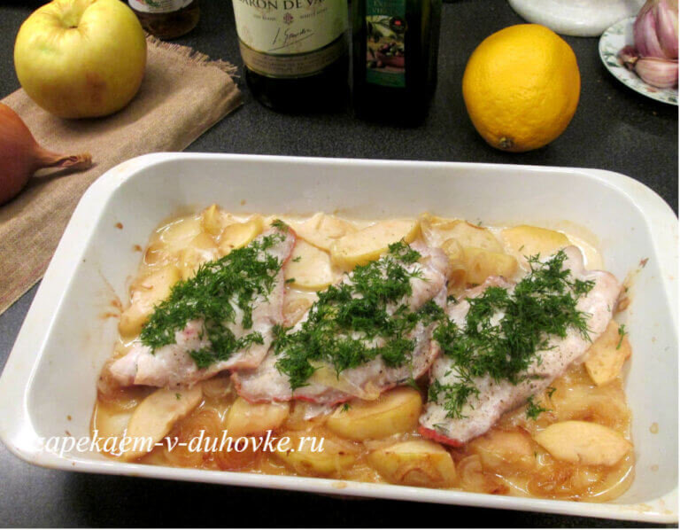 Если вы еще не пробовали филе морского окуня, запеченного в яблоках, тогда непременно приготовьте эту невероятно вкусную рыбу. Яблоки, их лучше брать кисло-сладких сортов, слегка припущенные на сливочном масле с луком, с добавлением вина - это подушка для запекания рыбы. Результат оказался выше ожидаемого. Появляется еще одно полезное рыбное блюдо, у которого приятный вкус. Я бы сказала яркий вкус окуня. Потрясающая морская рыба стала еще вкуснее. Блюдо готовится так быстро, что может стать настоящей палочкой-выручалочкой. Занятые хозяйки обязательно это оценят. Морской окунь очень полезная рыба. Особенно выловленный в северных морях. Не забывайте о ее полезных свойствах и готовьте рыбные блюда чаще. Как запечь морского окуня в духовке с яблоками Рецепт на 3 порции, время приготовления 50 минут с учетом маринования. Нам потребуются следующие ингредиенты: Прежде всего готовим рыбное филе: моем его под проточной водой. Затем слегка подсушим. Далее поливаем ее выдавленным из полови