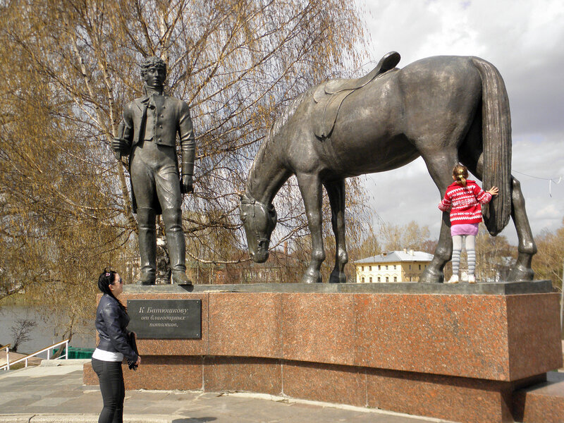 Девочка с интересом изучает особенности памятника коню Батюшкова.