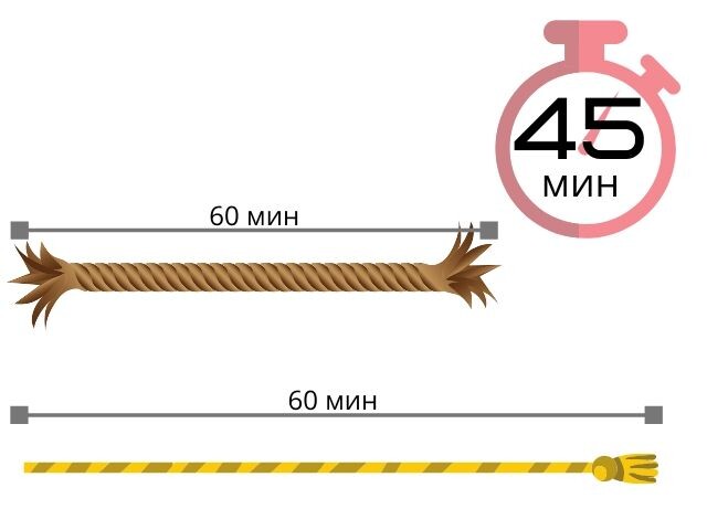 У мужчины есть две верёвки разной толщины. Каждая из верёвок сгорает ровно за 60 минут, если поджечь один её конец. Мужчине нужно измерить ровно 45 минут, используя только эти две верёвки. Он не может резать их пополам, но может их поджечь своей зажигалкой. Каждая верёвка горит неравномерно, то есть одна часть может гореть быстрее, а другая медленнее. Как ему измерить 45 минут? Решение сразу под картинкой. Читайте также: Логическая задача, которую задают на собеседовании в крупные компании Решение логической задачки 1. Сначала он поджигает оба конца первой верёвки и один конец второй. 2. Спустя 30 минут первая верёвка сгорает и в это же время он поджигает другой конец второй верёвки. Теперь вторая веревка полностью сгорит через 15 минут. Получается 30 мин (первая верёвка) + 15 мин (вторая верёвка) = 45 мин. 👍 Не забудьте поставить палец вверх! 🤗 ✍️ Подписывайтесь! Будет ещё много интересного! 😎
