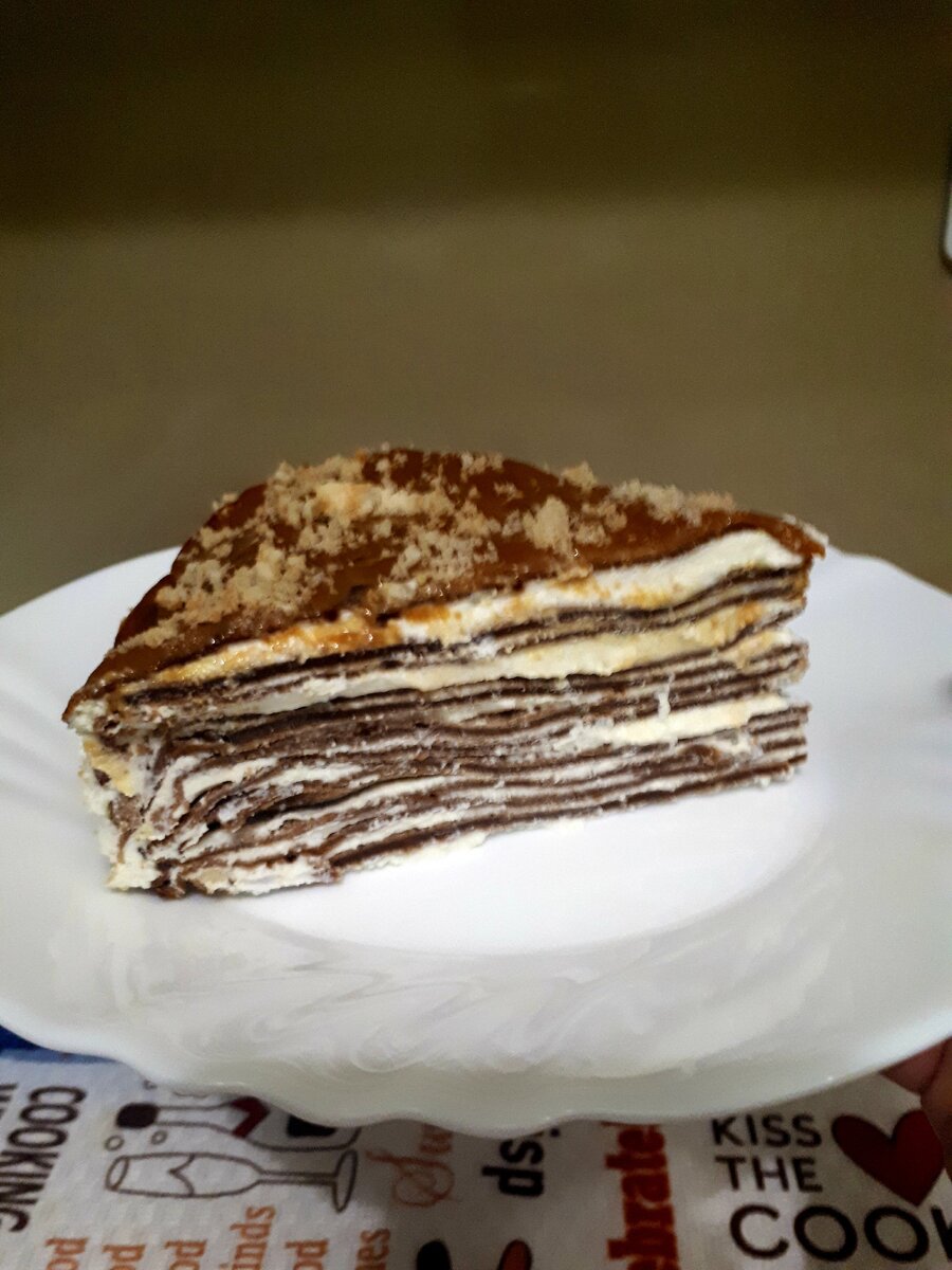 Очень нежный и очень вкусный Блинный тортик. Просто тает во рту. Ингредиенты. Яйцо-2шт Мука-180гр Сахар-2ст ложки Соль-щепотка Разрыхлитель-1ч.ложка Какао порошок-3ст.ложки Молоко-250мл Вода кипяток-125мл Масло растительное-для жарки блинов. Для крема. Творог-400гр Сметана-250гр Сахарная пудра-2ст ложки Приготовление. - Готовим тесто. Яйца смешиваем венчиком с сахаром, солью. Добавляем молоко, муку, разрыхлитель, какао, всё хорошо вымешиваем венчиком. Вливаем кипяток, ещё раз всё хорошо перемешиваем до однородной массы без комочков. - Выпекаем блины обычным способом. -Даём блинам остыть, тем временем готовим крем. -Соединяем творог, сахарный песок, сметану, перемешиваем блендером до однородной массы. - Каждый блин промазываем творожным кремом, складывая их друг на друга. -Сверху тортик я промазала варёной сгущёнкой. Тортик можно кушать сразу, а можно дать ему настояться 2 часа. Получилось очень вкусненько, порадуйте своих близких. Приятного аппетита. Если вам понравился рецепт, с