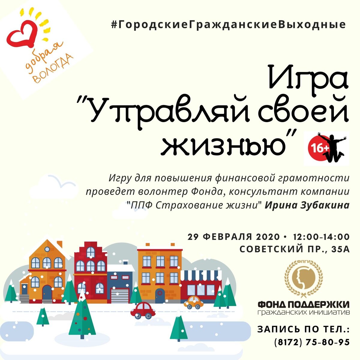 Игра по повышению финансовой грамотности начнется в 12:00 во время городского гражданского выходного "Добрая Вологда" по адресу: Советский пр., 35а, 2 этаж. Информация по телефону (8172) 75-80-95. Участие бесплатное, но обязательно регистрироваться: https://vk.cc/9OVWu2