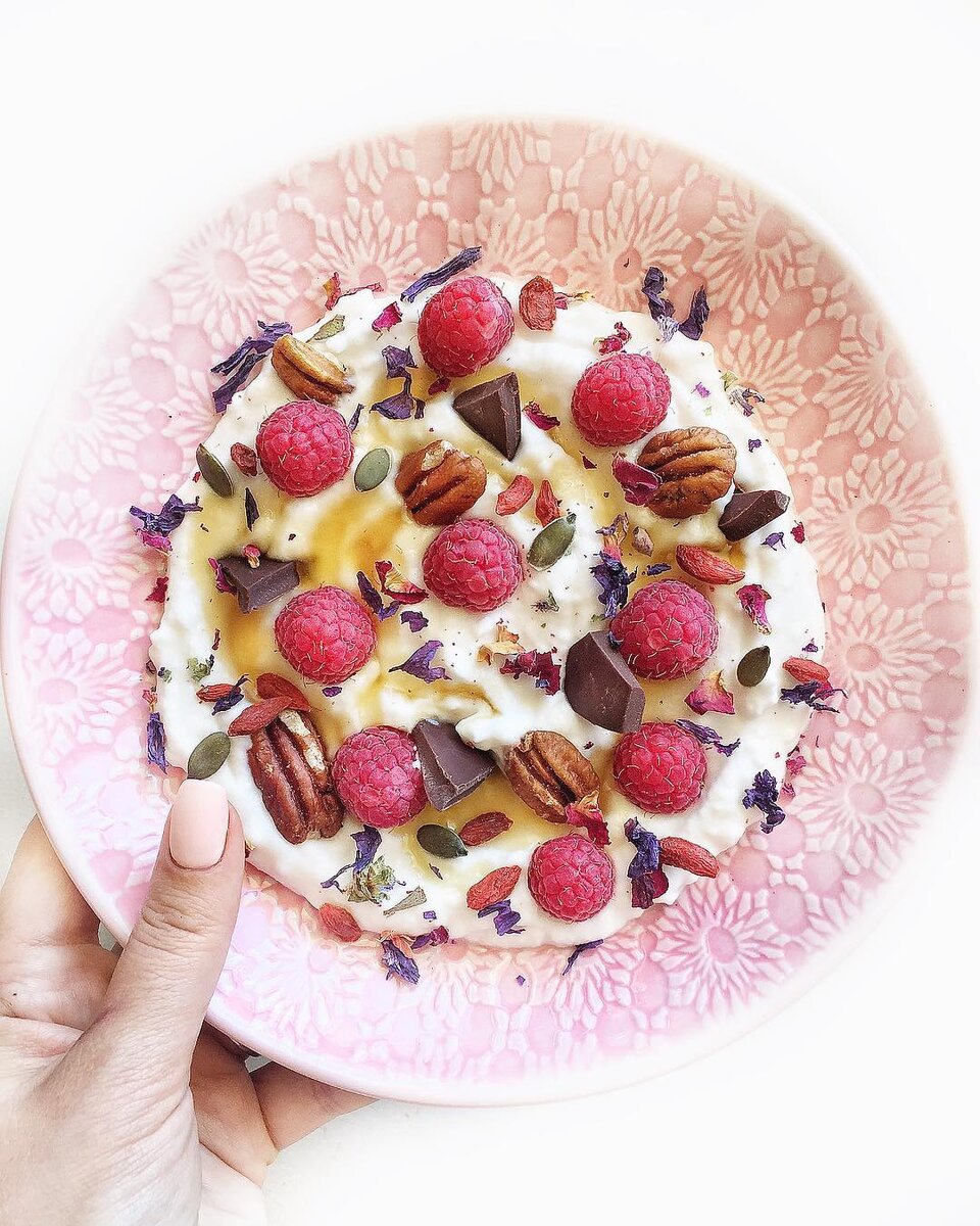 Для приготовления такой красоты вам потребуется: кокосовый йогурт, ложка клинового сиропа, малина, орехи пекан, ягоды годжи, тыквенные семечки и чёрный шоколад.