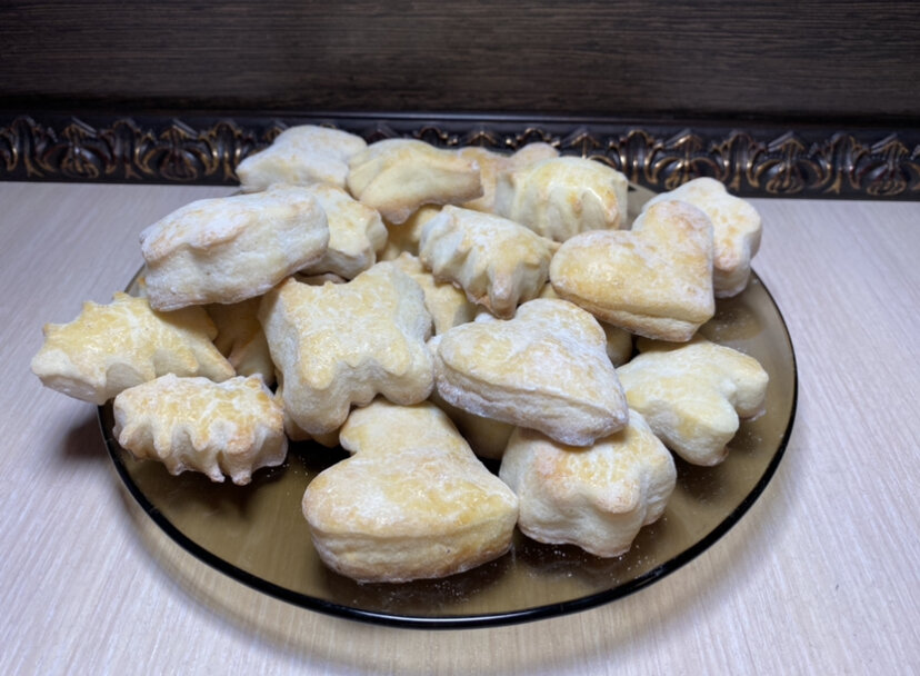 Печенье "Сметанное" Ингредиенты: сливочное масло - 100 г, сметана - 200 г, сахар - 0,75 стакана, ванильный сахар - 1 столовая ложка, яйца - 2 шт, мука - ~3,5 стакана, разрыхлитель - 1,5 чайных ложки сахарная пудра для посыпки готового печенья Приготовление: 1. Муку просеять и соединить с разрыхлителем и ванильным сахаром. 2. Яйца взбить с сахаром при помощи венчика. 3. Добавить размягченное сливочное масло и перемешать. 4. Добавить сметану и еще раз хорошо перемешать. 5. Постепенно всыпать в яично-сметанную массу муку с разрыхлителем и замесить мягкое некрутое тесто. * Тесто при замесе липнет к рукам, но этого не стоит пугаться. Введите в тесто достаточное количество муки, чтобы из теста можно было сформировать шар, хорошо подпылите тесто мукой со всех сторон и переложите на тарелку. 6. Тесто убрать в холодильник на 2-3 часа. 7. Готовое охлажденное тесто раскатать на посыпанном мукой столе в пласт, толщиной, ~4-8 мм и вырезать формочкой (обмакнув формочк