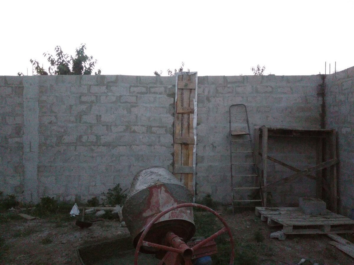 После завершения кладки стен ,приступаю к заливке колонн.Выставляю опалубку на колонны ,делаю опалубку из дюймовой доски шириной 15 см с 3 досок,получается 45 см. Выставляю сразу на 3 колоны и за день заливаю ,через 2 дня снимаю и переставляю на следующие 3 колоны и так пока не залью все. Залив все колоны, связал каркас на пояс. Опалубку на пояс то же делаю частями ставлю метров на 10 заливки бетоном и залив этот отрезок бетоном переставляю дальше. При заливке пояса вставляю в бетон шпильки для закрепления мауэрлата, шпильки с резьбой 12 мм диаметр. порезанных по 33 см и загнутые концы под углом 45 градусов в бетон. Перемычки на окнах заливаю с поясам заодно. Следующий этап будет крыша.Спасибо если дочитали до конца)