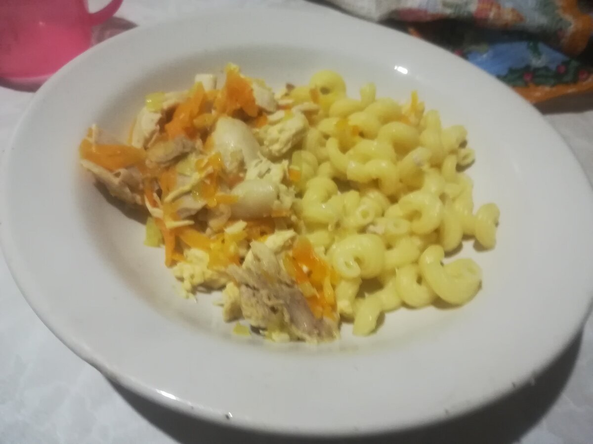 Ингредиенты Отвариваем курицу, солим по вкусу достаём остужаем. В этом же бульоне варим макароны, сливаем бульен, промываем макароны, обжариваем мелко нарезанный лук, и потертую морковку, туда же добавляем курочку разделаную на кусочки и жарим вместе ещё минут 5. Приятного аппетита!