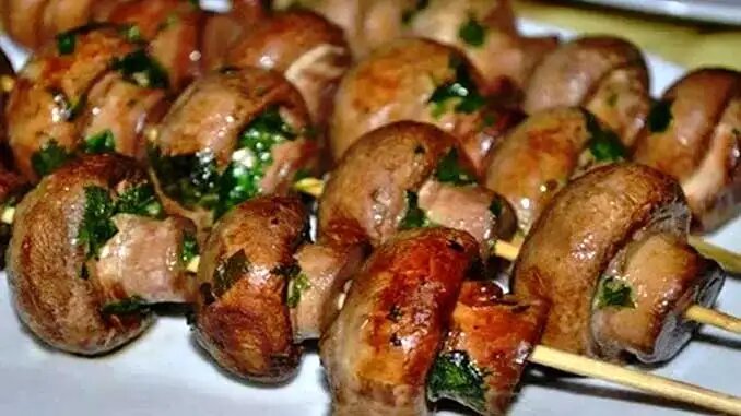 Хотите попробовать вкусный шашлык из грибов, не разводя костёр и не тратясь на ресторан? Нет ничего проще! Надо лишь замариновать грибы на полчаса, нанизать на шпажки и запечь в духовке. Вот популярный рецепт: Ингредиенты: Инструкции: Хорошенько помыть грибы и расстелить на чистом полотенце, чтобы вся лишняя влага впиталась. Поместить грибы в пакет. Туда же добавить растительное масло, соевый соус, паприку, соль, лимонный сок, а также измельчённый укроп. Закрыть пакет, встряхнуть содержимое и оставить на 30 минут. Смочить шпажки водой и нанизать на них маринованные грибы. Разогреть духовку до 200 градусов и перенести шпажки с грибами на противень. Запекать 15 минут. Если вы или ваши гости не едите мяса, теперь у вас есть отменное угощение!