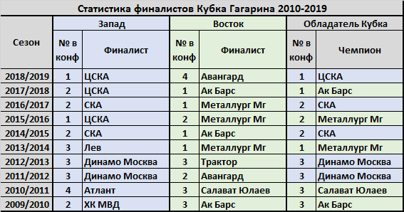 Рассмотрим статистику финалистов Кубка Гагарина за десять сезонов с 2009/2010 по 2018/2029, клубы с каких мест в конференциях доходили до финала, с каких становились Чемпионами. Первый сезон КХЛ 2008/2009, когда сетка плей-офф строилась не по конференциям в расчет брать не будем. Забегая вперед, можно сказать что вероятность финала Йокерит vs Барыс оценивается в 9%. Увы, в финалах Кубка Гагарина никогда не играли команды занявшие ниже 4 места в своих конференциях. По шесть раз в финалах плей-офф оказывались обладатели первых, вторых и третьих мест конференций, два раза в финал проходили обладатели четвертых мест. Таким образом, вероятность выхода в финал обладателей 1, 2 и 3 мест в конференциях можно оценить в 30%, 4 места в 10%. Соответственно, совместная вероятность встретится обладателям 2 места востока (Барыс) и 3 места запада (Йокерит) оценивается в 9%. Любое сочетание в финале обладателей 1, 2 и 3 мест конференций также оценивается вероятностью 9%. Сочетание обладателя 4 места