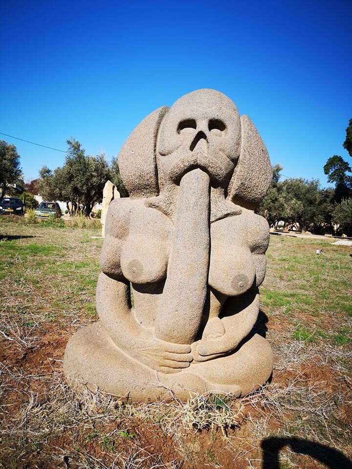 Базальтон - компактный сад скульптур Дагана Шкаловски. Я всегда с уважением отношусь к творческому замыслу художника и стараюсь его постичь. Чего бы это ни стоило. Одна скульптура - фигура с лицом черепа, женской грудью и крыльями за спиной. Во рту он держит огромный член. Свой собственный. К нему обращены взгляды других фигур, с ужасом и завистью на лицах. Очевидно, персонаж с членом во рту, это мужчина, у которого сбылись все мечты сразу. Представляю, как Скульптор спрашивал у своего будущего творения: "чем тебя порадовать, моё любимое создание? Какую мечту исполнить?"