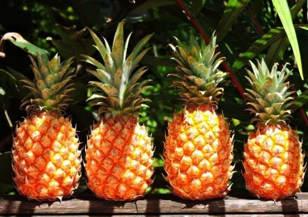 Ананас имеет удивительно богатый витаминно-минеральный состав. Это не только вкусное лакомство, но и очень полезный для здоровья продукт. В нем много витамина С, А, Е, РР, витаминов группы В. В сочетании с содержащимися в плодах алкалоидами эти витамины становятся стимуляторами бодрости и приносят организму повышенную пользу. Ананасовая мякоть богата магнием, йодом, калием, кальцием, железом, цинком и фосфором. Она содержит натуральные сахара, органические кислоты и пищевые волокна. Особую ценность в ананасовой мякоти представляет бромелайн. Это фермент обладает способностью улучшать пищеварение, а также оказывает противовоспалительный, антитромботический, противоопухолевый и иммуностимулирующий эффект. А еще бромелайн обладает способностью расщеплять жиры, поступающие в организм человека с пищей. Благодаря этому свойству бромелайн получил славу жиросжигателя и стал популярным в диетологии. Но ускорить сжигание уже имеющихся жировых запасов в организме фермент способен только в случ