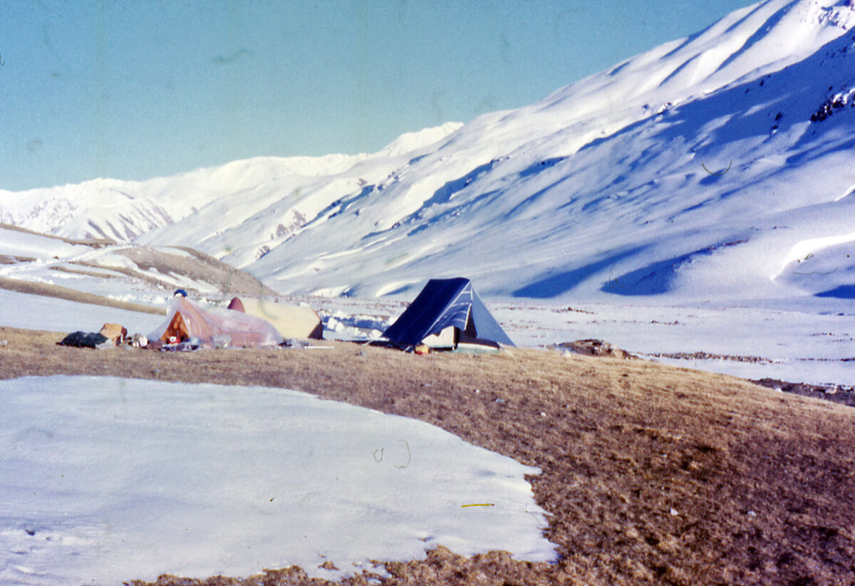 Боже, как нам не хотелось вылезать из теплой машины на мороз! Да, наверху, в отличии от теплого берега озера, был мороз около 5 градусов. Злобно матерясь, мы напяливали на себя теплую одежду. Тут оказалось, что так как мы не планировали выходить на снег, зимнее снаряжение у нас отсутствовало как класс. Кое-кто даже был в кедах. Рукавиц не было ни у кого. Решение принимали быстро. Нужно как можно скорее перевалить на южный склон (мы были на северном), а уж там наверняка солнце давно растопило весь снег и мы будем спускаться по колено в зарослях весенних рододендронов. Сказано сделано и мы рванули вверх на перевал. Но он оказался гораздо дальше. А снег, с каждым шагом вверх становился всё глубже. Через пару часов солнце закатилось за ближайший пик и температура мгновенно упала до -20 градусов. С нашей летней снарягой, для нас стали наступать не лучшие минуты. Мы сбросили рюкзаки и веслами начали расчищать в снегу место под палатку. У нас их было три, но для тепла решили ставить одну. Руки скрючивало без рукавиц, на поднявшемся ветру. Думаю, если бы мы не успели за несколько минут поставить палатку и залезть в нее, всё могло бы кончиться плохо. В двухместной палатке шесть парней улеглись валетами и быстро надышали нормальную температуру. Кто-то нашел в кармане шоколадку и т.к. рюкзаки остались снаружи, она и стала нашим ужином.