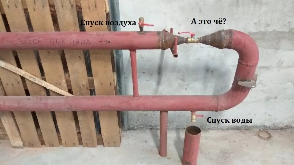 Казалось бы — обычная труба отопительной системы. Есть кран для выпуска скопившегося воздуха, есть кран для спуска воды. Возможно есть необходимость регулирования потока воды проходящей по этой трубе. По всей видимости, не хватило денежных средств на кран соответствующего типоразмера и мастер влепил полдюймовый кран. Но! Вы посмотрите как ему пришлось заморочиться: одни только конусные переходки чего стоят! А самое главное… никого не смущает, что расход жидкости снижен в несколько раз? И это даже при открытом кране… Более того… Сдаётся мне, что кран был ввинчен до момента проварки стыка с основной трубой. Это я к тому говорю, что кран в случае необходимости поменять не получится. Отломилась ножка у фужера? Не беда! Несколько слоёв бинтика и фужером снова можно пользоваться. Хотя… Я бы посоветовал воспользоваться синей изолентой. Она надёжнее. Проверено народом. Скажите: «Когда вы сидите на стуле, вы любите качаться на задних ножках?» По данным исследований учёных одного уважаемого ун