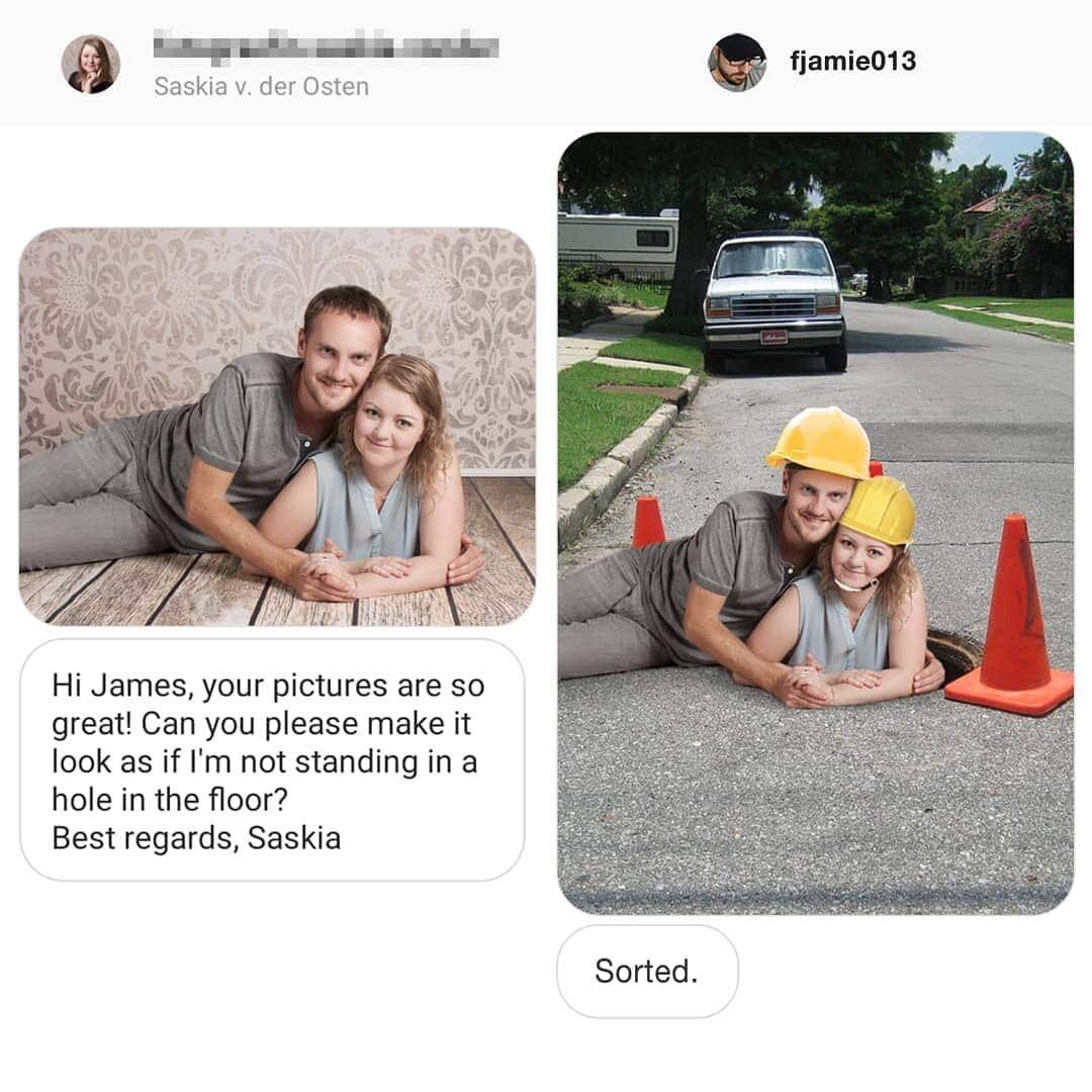 Дизайнер Джеймс Фридман уже не первый год троллит людей, которые просят отретушировать их фотографии. Получается это у него так смешно, что людям такие работы, кажется, не наскучат никогда. Приятного просмотра! «Можешь сделать так, чтобы это не выглядело так, будто я вылезаю из дыры в полу?» «Можешь сделать так, чтобы вода попадала мне в рот?» «Можешь сделать так, чтобы мое лицо отражалось в скульптуре?» «Джеймс, мои руки странно выглядят — сделаешь так, чтобы я держалась ими за поручень?» «Можешь добавить листьев на дерево?» «Можешь как-нибудь переместить мои руки и сделать так, чтобы я держала в руках магический шар?» «Сможешь сделать так, чтобы мы с друзьями были снаружи? Спасибо!» «Сделаешь эту фотографию более романтичной?» «У моего сына кривая бабочка, и это меня бесит. Можешь ее выровнять?» «Можешь убрать парня сзади? Он портит мою фотографию» Понравилась статья? Ставьте лайк и подписывайтесь на канал. Не забывайте делиться своими впечатлениями о прочитанном в