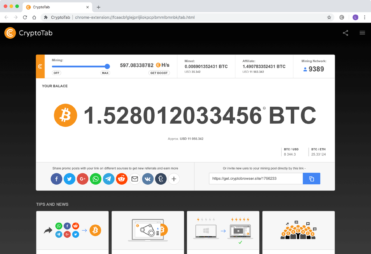CryptoTab Браузер Что такое CryptoTab Браузер? CryptoTab Браузер это бесплатный, легковесный браузер с дополнительным функционалом для майнинга. Браузер может быть персонализирован в соответствии с вашими пожеланиями огромным количеством доступных расширений, чтобы сделать ваш опыт просмотра веб-страниц максимально быстрым и комфортным. Чем CryptoTab Браузер отличается от других популярных браузеров? CryptoTab Браузер является единственным в своем роде программным обеспечением, разработанным специально для майнинга. Благодаря встроенному алгоритму майнинга, вы можете просто просматривать веб-страницы и зарабатывать биткойны одновременно. Также, будучи пользователем CryptoTab Браузера, вы имеете возможность участвовать в нашей реферальной программе, где можно приглашать друзей, привлекать новых рефералов, продвигать CryptoTab Браузер через социальные сети и увеличивать за счет этого свой доход. Майнинг в CryptoTab Браузере Как настроить учетную запись для майнинга? Откройте Cryp