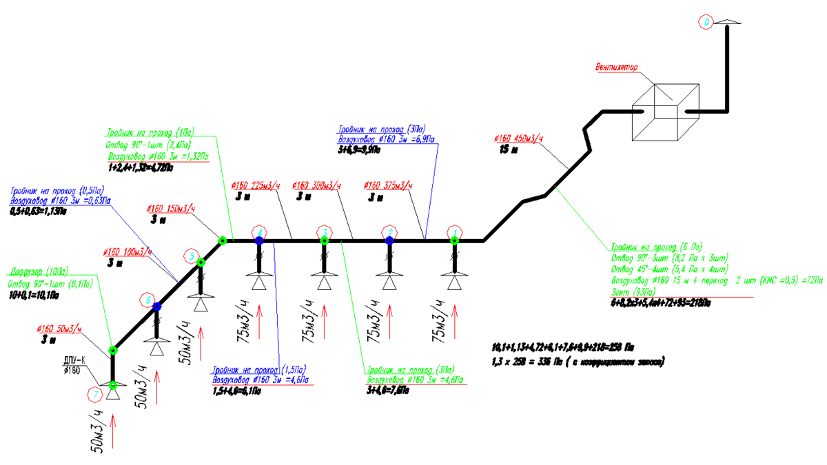 Аэродинамический расчет вытяжной системы вентиляции. Расчет существующей системы вентиляции. Статья предназначена для специалистов, работающих по специальности ТГВ. Статья приведена частично, в полном объеме материал находится тут. Доступ платный. Аэродинамический расчет начинают с вычерчивания аксонометрической схемы. Далее указываются номера участков, расходов (м3/ч) и длин (м) Определяют направление аэродинамического расчета - наиболее удаленного и нагруженного участка до вентилятора. В некоторых сложных системах может быть и такое, что самый удаленный участок может являться не самым нагруженным. Когда опыта будет больше, то уже достаточно будет одной аксонометрической схемы, где и будет вся информация.