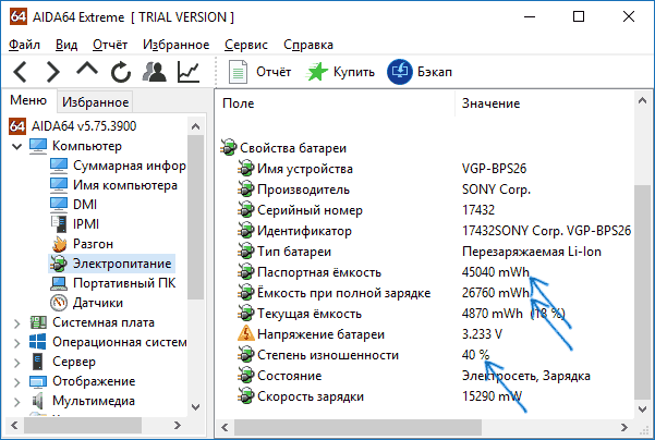 Есть много способов выполнить такую проверку, в том числе и встроенное в Windows 10 и 8 средство для создания отчета о батарее ноутбука, но я бы рекомендовал использовать программу AIDA64 — она работает почти на любом оборудовании (в отличие от упомянутого ранее средства) и предоставляет всю необходимую информации даже в пробной версии (сама по себе программа не бесплатная).