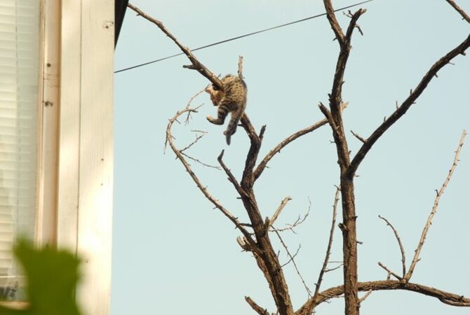 Гляжу как-то раз в окно, вижу на дереве кошак висит. Причем именно не сидит, а висит в У-образной развилке на пузе, свесив лапки в разные стороны. Но живой: ему когда говорили снизу "кис-кис" он глаза открывал и говорил "мяу". Снять его пытались долго и разными способами: чегой-то кидали, пацанов засылали, и.т.д. Но не получалось: кот почти на самой верхушке сидел. И вот моя моя мама (М) движимая гуманизмом позвонила в службу спасения. Отвечает спасатель (С) и происходит у них следующий разговор: (М) Здраствуйте, а вы животных тоже спасаете? (С) Ну, в определенных случаях (М) У нас тут кот во дворе на дереве висит (С) Ваш кот? (М) Нет, не мой (С) Давно висит? (М) Три дня (С) Ну, вот когда с неделю повисит, тогда и приедем снимать (М) Так помрет же котик! (С) /Благожелательно так/ Скажите, а вы когда-нибудь видели КОШАЧЬИ СКЕЛЕТЫ НА ДЕРЕВЬЯХ? Правдивая история эта закончилась благополучно: дерево спилили вместе с котом, кот плюхнулся на землю и убежал, никого не поблагодарив. Вот такие