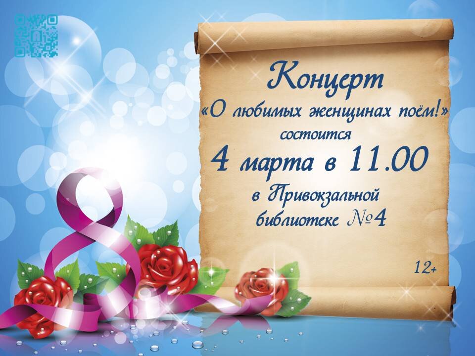 Праздничный концерт, посвященный Международному женскому дню, состоится 4 марта в 11.00 в Привокзальной библиотеке №4 (Суфтина, 32). Поздравить северянок с наступающим праздником придут самодеятельные артисты ансамбля «Надежда». Ведущая, руководитель хора Ижмякова Антонина Ивановна, подготовила слова благодарности, поздравлений и пожеланий гостям мероприятия. Сегодня «Надежда» – многожанровый коллектив, в его репертуаре песни советских и российских композиторов, народные песни, задорные частушки, лирические стихотворения. Откроется мероприятие исполнением песни «Мама». В программу концерта войдут известные композиции «Ах, черемуха белая», «Разгорелась заря золотая», «Красна девица вила кудёрышки». Завершится мероприятие исполнением шуточной песни «Ласковый мужик». Приглашаем всех желающих на праздничный концерт. О мероприятиях в библиотеке можно узнать по телефонам: 64-06-26; 29-00-19