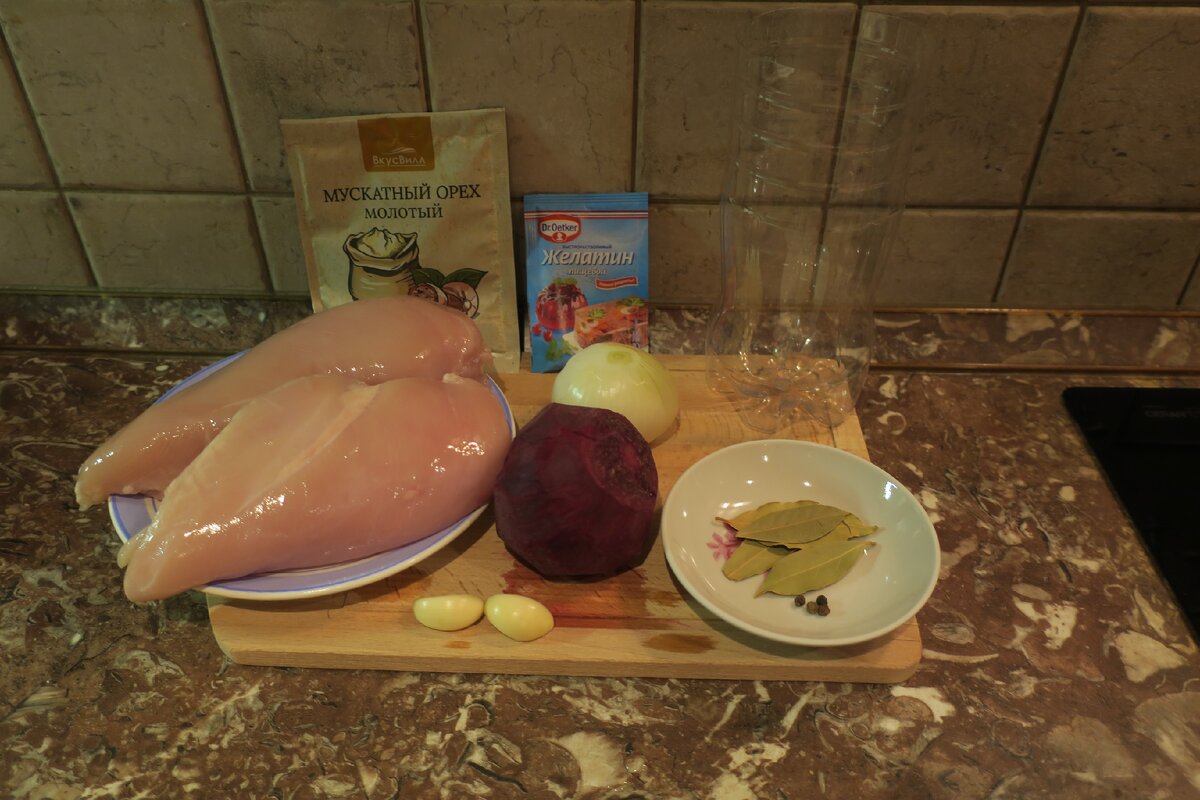 Нам понадобится: Куриная грудка – 2 штуки – 450-500 грамм, Куриный бульон – 250 мл, Лук репчатый - 1 штука, Лавровый лист – 2-4 штуки, Перец черный горошком – 5 штук, Сок свеклы -0 1 столовая ложка, Желатин – 10 грамм, Мускатный орех – 1/3 чайной ложки, Чеснок – 3 зубчика, Соль – 1 чайная ложка. Куриную грудку моем, заливаем холодной водой и ставим на плиту. После закипания сливаем бульон, курицу моем. Заливаем чистой холодной водой. Добавляем лук, лавровый лист, перец горошек. Доводим до кипения и варим 20-30 минут. Свеклу натираем на терке. Выжимаем сок. Куриную грудку разделяем на части. Из кастрюли берем 250 мл бульона и добавляем 10 грамм желатина. Добавляем мускатный орех и соль. Добавляем сок свеклы. Добавляем чеснок, пропущенный через пресс. Добавляем бульон с желатином. Погружным блендером все мелко перетираем. Остывшую до 30-35 градусов массу перекладываем в обрезанную чистую пластиковую бутылку. Массу утрамбовыва