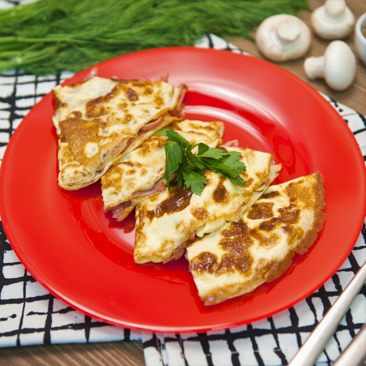 петрушка Способ приготовления 1. Нарезаем лук и ветчину соломкой, грибы — ломтиками. Обжариваем измельчённые ингредиенты на растительном масле. Перчим и откладываем. 2. Разбиваем в миску два яйца, добавляем молоко, отпекаем в виде блинчиков. Выкладываем начинку, складываем пополам и разрезаем на две части. 3. Украшаем петрушкой и подаём. Приятного аппетита! Еще больше рецептов на сайте tveda.ru Любите читать Дзен Телеканала «Еда»? Расскажите свое мнение о материале в комментариях и ставьте лайки