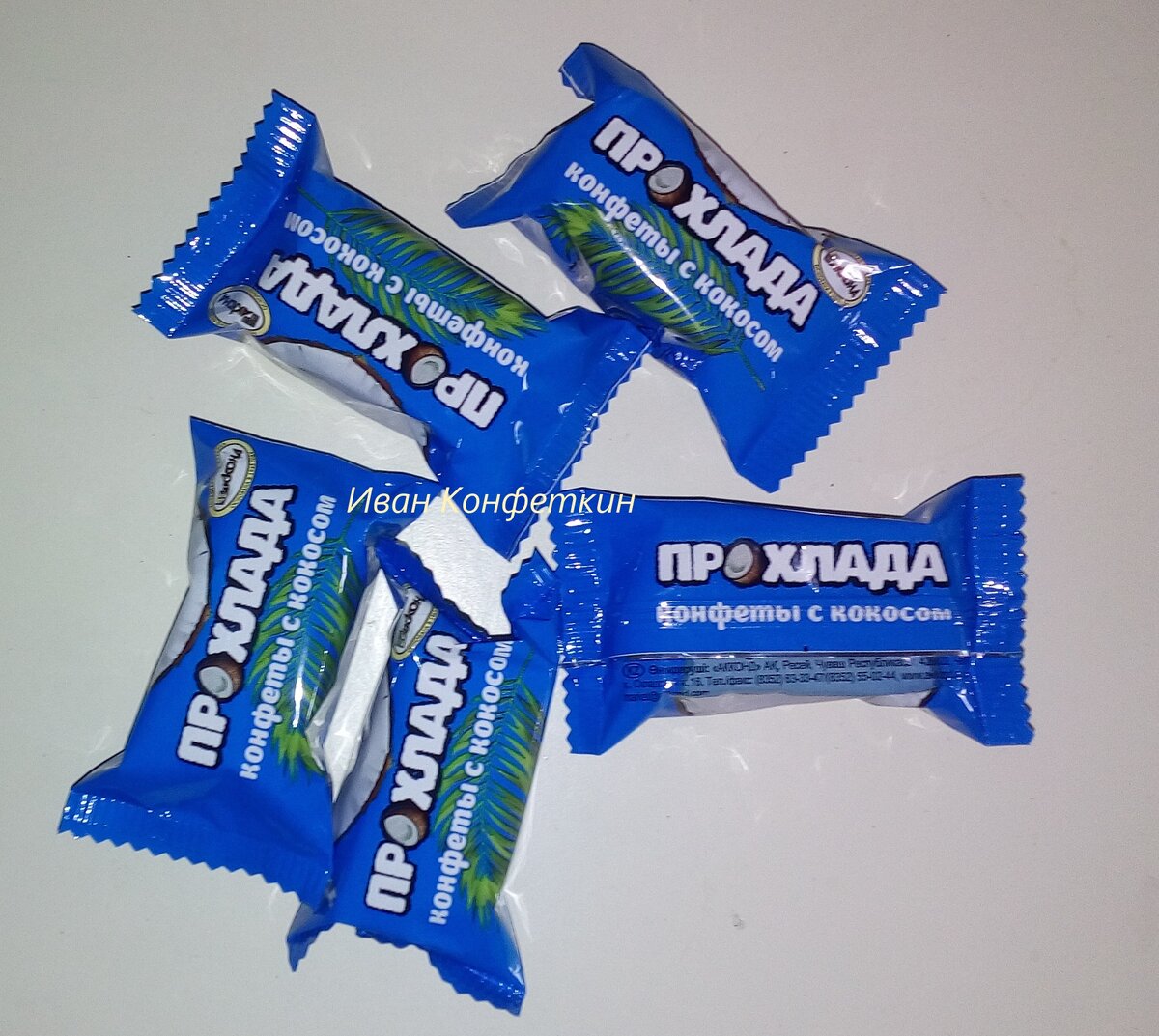 Купил вот такое чудо... Конфеты "Прохлада" от Чебоксарской фабрики «Акконд» содержат достаточно большое количество кокосовой стружки, а сверху покрыты, как я думал, шоколадной глазурью. Прочитав состав, догадался, что это эквивалент настоящего шоколада. Познакомлю с составом конфет... Сахар, кокосовая стружка, патока, влагоудерживающий агент (сорбитовый сироп), эквивалент масла какао (на основе растительных масел — пальмовое и ши), тертое какао, сыворотка молочная сухая, сухое обезжиренное молоко, белок яичный, обезвоженный молочный жир (пастеризованное молоко), соль, эмульгатор соевый лецитин, ароматизаторы, антиокислители аскорбиновая кислота, альфа-токоферол. Безусловно, хотелось бы действительно ШОКОЛАДНЫЕ конфеты, но тогда цена их была бы намного выше. В 100 граммах конфет содержится: Белков — 4 гр, жиров — 25 гр, углеводов — 55 гр, калорийность 461 ккал / 1926 кДж По поводу вкуса... Конфеты очень вкусные и ценители кокосовых начинок, думаю, оценят. Цена одного килограмма к