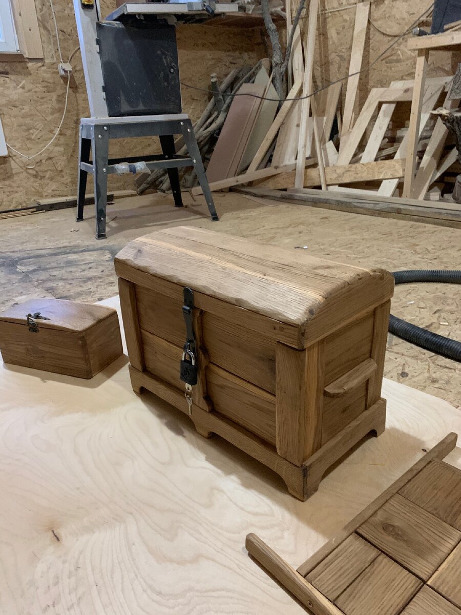 Дуб - материал очень твёрдый, но очень красивый. Всего у меня было три брёвна от старого деревенского дома. Распустил их на доски. Обработал. Немного посушил. Показываю что вышло: Сундучок. Очень красивый цвет. Даже не красил. Покрыл лаком бесцветным. Установил петли массивные и замок накидной. Шкатулку отполировал и покрыл лаком бесцветным. Установил маленькие петельки и задвижечку. Подготовил основу для будущих настенных часов. Пока не определился со стрелками и циферблатом. Хочется чего-то особенного для этого старого дуба. Покажу, когда закончу.