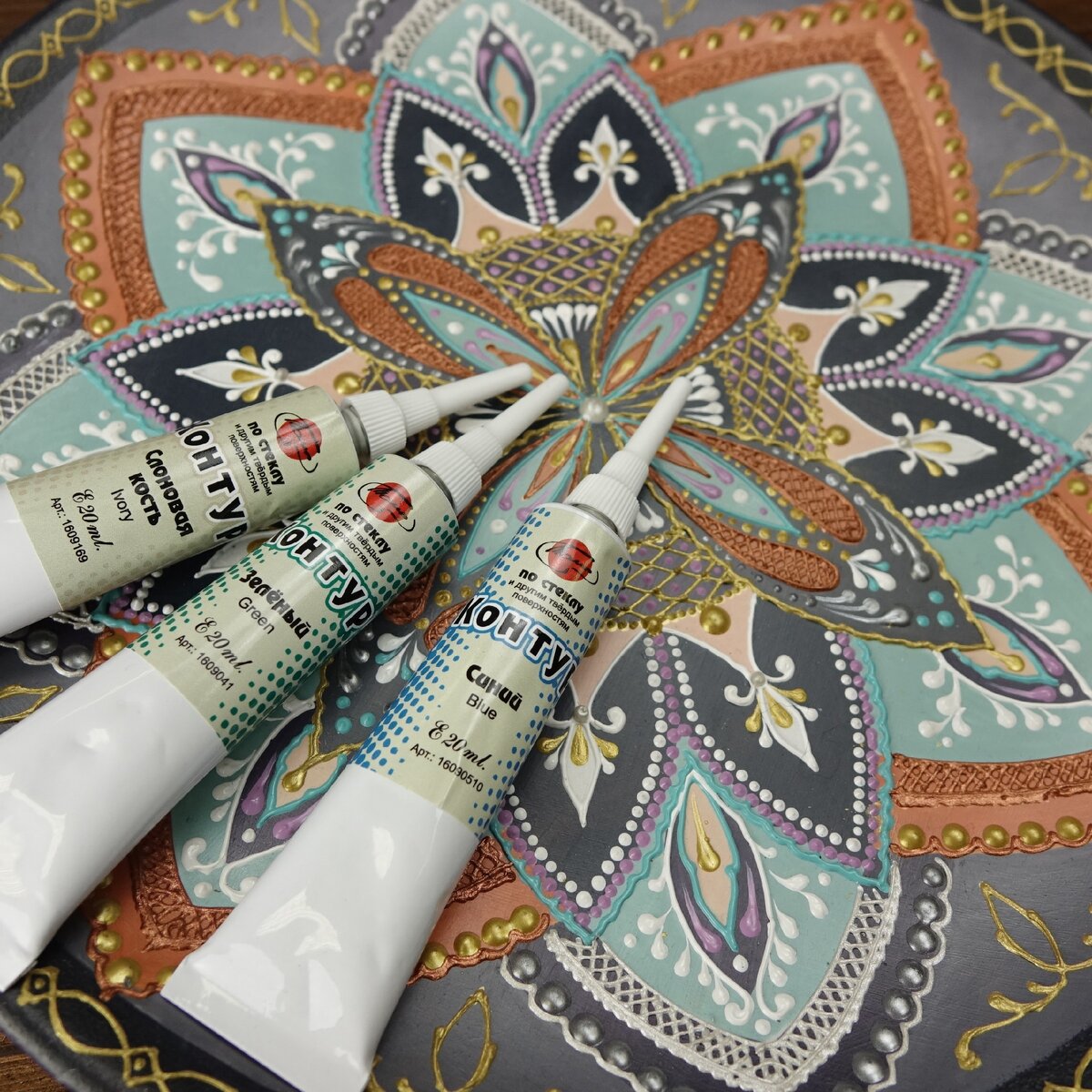 Точечная роспись – это особый вид рисования, когда рисунок создаётся из точек. Точки собираются в фигуры и линии, и в результате всё выглядит очень интересно – как бисерное плетение или наклеенные по рисунку стразы. Чтобы освоить технику точечной росписи, необязательно уметь хорошо рисовать. Узор либо наносят по заранее выбранному шаблону, либо изображают самостоятельно из отдельных линий и фигур, листочков или ромбиков, импровизируя в процессе работы. В качестве шаблона подойдут схемы для вышивки, художественные орнаменты, бисерные узоры, всевозможные рисунки. Расписывать можно любую поверхность: стекло, дерево, кожу, металл, пластик. Акрил считается лучшей краской для подобных целей благодаря ряду преимуществ: быстрый срок высыхания, насыщенный пастозный цвет, несмываемость после высыхания, совместимость со многими поверхностями. В нашем интернет-магазине представлен большой ассортимент для рисования контурами: контуры по стеклу и по ткани, контурная паста, контурный гель, контур