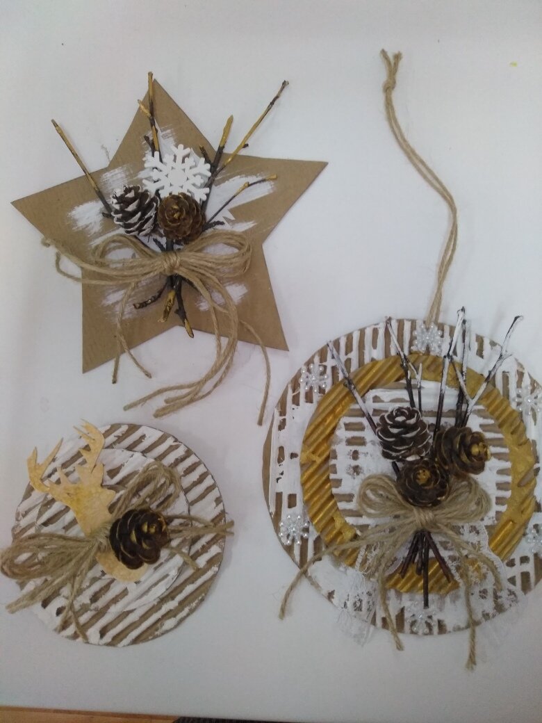 Я хочу поделиться мастер - классом новогодней игрушки своими руками, используя картон от упаковочных коробок и природных материалов (шишек, желудей, сухоцветов, веточек от деревьев) У каждого участника получится авторская рождественская звезда в рустикальном стиле. Мы будем использовать: - подручный материал; - природные материалы; - клей и ножницы. Делаем заготовку игрушки из картона. Необходимо три детали разного размера. После того, как вырезали, нужно убрать верхний слой бумаги, чтоб появилась гофрированная поверхность. Можно удалять не всё, оставлять немного бумаги. Используя губку и белую гуашь, покрываем звезды краской неравномерно ( как будто припорошило снегом) Накладываем одну звезду на другую и наматываем бичевку по диагонали, чтобы получилась звезда из веревки. Декорируем по желанию. Предлагаю вырезать из белой плотной бумаги оленя, ёлочки, заснеженные домики. Шишки и веточки можно покрасить белой краской, имитируя снег. Для оформления можно использовать любой материа