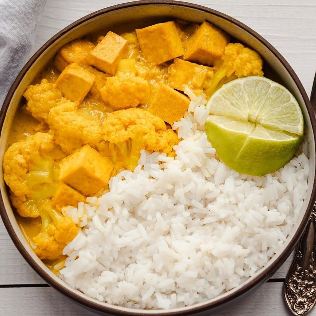 ▶️Добавьте желтую пасту карри. Перемешайте. Добавьте овсяное молоко, соевый соус, цветную капусту, жареный арахис и запеченный тофу. Хорошо перемеш
