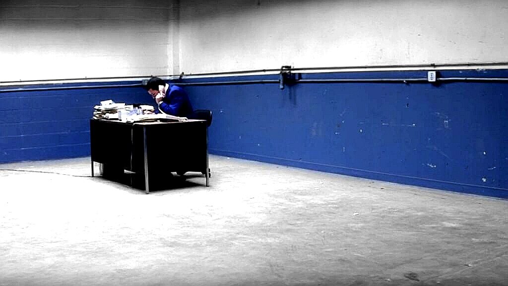 Человек в синем костюме сидит на фоне синей стены. В дальнем углу абсолютно пустого офиса. Похожего на бункер или бетонный склад. Затерянный среди холмов Лос-Анджелеса.