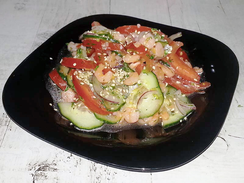 Сегодня спешу поделиться рецептом пикантного овощного салата с креветками, который с легкостью воплотит даже ребенок. Пригодится он и любящим мужчинам, которые не сильны в кулинарных науках, но при этом хотят порадовать даму сердца своего. Готовится быстро, самым длительным окажется процесс варки креветок. Время приготовления – 10 минут Количество порций – 1 🛒 Ингредиенты: 👩🍳 Как готовить: 1. Свежий помидор нарезаем дольками. Можно взять и помидорки черри. 2. Дольками, как и томаты, измельчаем огурец. 3. Полукольцами шинкуем сладкий салатный лук. Его количество берем по вкусу. Можно заменить на зеленые перья лука. 4. Для пикантной заправки возьмем мед, горчицу, яблочный уксус и масло. 5. Смешиваем ингредиенты, добавив отварные креветки, заправку и рубленую зелень. Подавать салат нужно сразу после приготовления, чтобы он не «потек» и на приобрел лишнюю кислинку. Приятного аппетита! Чтобы не пропустить новые рецепты, ставьте 👍 и подписывайтесь на Poperchi! А также не забудьте заглян