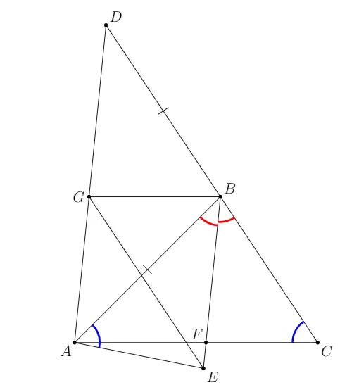 Продолжаем разбирать задачи 55-го уральского турнира юных математиков. Все геометрические задачи турнира можно посмотреть тут. А за публикациями можно следить на телеграм-канале Олимпиадная геометрия. Сегодня, в ожидании задач питерской и московской олимпиад, а также задач Romanian Masters, разбираем задачу первого тура высшей лиги в группе 7-го класса, условие которое приведено ниже. Первый шаг в решении более или менее понятен — отметить равные углы и заметить главное, что прямая AD параллельна биссектрисе BE, поскольку углы при основании равнобедренного треугольника ABD равны как раз по половине угла B (отмечены красным). Это означает, что четырехугольник EGDB является параллелограммом, и поэтому AB=BD=GE. Вторым шагом замечаем, что в четырехугольнике AGBE есть параллельные стороны и равны диагонали, следовательно он оказывается равнобедренной трапецией. Как следствие получаем, что углы EAB и EGB равны. В итоге прямая GB параллельна прямой AC и AGBF — параллелограмм, получили, что