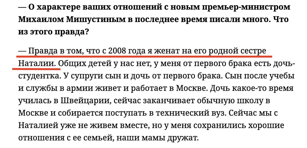 Нью-йоркские квартиры семьи премьера 27.02.2020, 13:5774Магнитский, Мишустин, НДС, расследование Или «Семья премьер-министра Мишустина связана с делом Магнитского». Или «Зять главы Налоговой службы промышляет незаконным возвратом НДС». Какой вам заголовок больше нравится? Любой подходит. Вот честное слово, еще два дня назад я и представить не мог, что могу написать такой заголовок к расследованию. А теперь вот пишу, и это чистая правда. Вот что: Это фрагмент интервью «бизнесмена» Александра Удодова изданию «Известия». В первом же абзаце — сенсация. Хоть его никто об этом не спрашивал (перечитайте вопрос), и никто никогда об этом не писал, Удодов вдруг заявляет: он женат на родной сестре премьер-министра Мишустина. Вы знаете, с момента назначения Мишустина его пиар-служба разместила много смешной и нелепой заказухи, имеющей своей целью отмыть не очень чистую биографию чиновника и объяснить, откуда у него миллиарды. Журналисты-ипотечники старались, как могли. Коммерсантъ называл его «