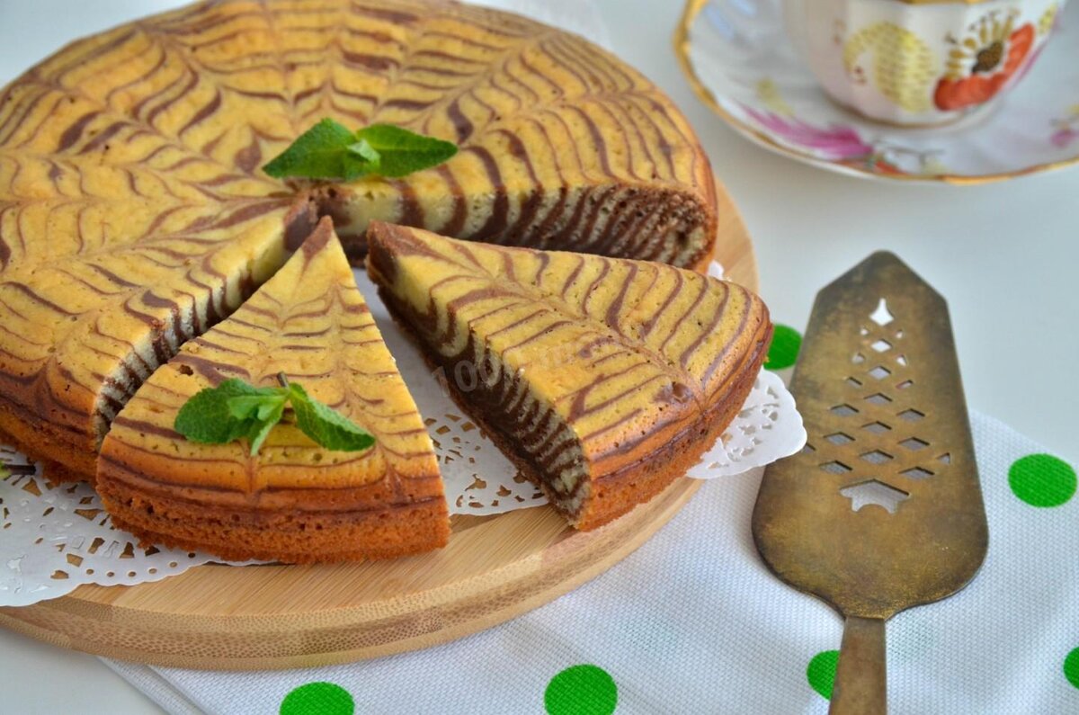 Если вы еще не пробовали испечь пирог «Зебра», обязательно попробуйте. Выпечка очень вкусная, мягкая, не приторная. Процесс исполнения несложный. Внешний вид эффектный и презентабельный. Время приготовления 1 час Калорийность 275 ккал /100 г Ингредиенты (8 порций) · сметана (21%) – 1 стакан; · яйца – 3 шт; · мука – 1,5 стак; · соль – по вкусу; · сахар – 200 г; · разрыхлитель – 1 ч. л; · какао-порошок – 2 ст. л Готовим тесто Сметану и яйца следует заранее достать из холодильника. Продукты должны быть комнатной температуры. В миске соединяем яйца и сахар. Миксером взбиваем в пышную белую массу. Добавляем сметану. Подойдет продукт любой жирности, но чем жирнее, тем лучше. Продолжаем взбивание на умеренной скорости. Просеиваем муку с солью и разрыхлителем. Порциями добавляем в яичную смесь. Перемешиваем. Консистенция теста получается однородной, жидкой. Делим массу на две части, где одна будет меньше другой. Туда, где меньшее количество теста, всыпаем какао-порошок. Перемешиваем. Просе