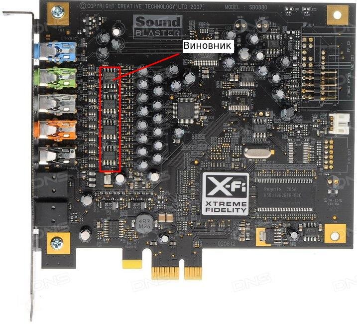 Озадачился сделать из комнаты домашний кинотеатр, купил проектор, сделал из МДФ и натяжного потолка экран, прикупил звуковую карту Creative X-Fi Titanium 7.1 и подключил старую аккустику Sven IHOO 5.1. Но радость была недолгой. Столкнулся с такой неприятной штукой как шум в передних колонках. Усилитель звука воспроизводит шуршание жёсткого диска и прочие помехи от питания в компе, даже перемещение мыши отзывалось в колонках, но только во фронтальных. Как оказалось в этом виноват операционный усилитель звуковой карты и слабая помехозащищенность. Эти усилители стоят на каждой паре каналов, в моём случае их 4 штуки т.к. звуковая карта 8и канальная. Но на фронтальные каналы (зелёный разьём) этот усилитель другой нежели чем остальные, он так же предназначен для подключения наушников, от сюда и все проблемы. Почитав аудиофильские статейки я решил поменять этот операционный усилитель на другой без усиления для наушников, купил, выпаял родной, впаял рекомендованный но не фортануло, шума стало