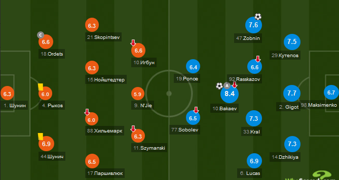 Привет, подписчики и читатели моего канала. В этой статье пойдёт о матче "Динамо" - "Спартак". Этот матч начинался с минуты молчания в память о ветеране "Спартака" Валерии Рейнгольде. Красно-белые активно начали первый тайм. Новичок команды Александр Соболев неплохо себя проявил в дебютном матче. Несколько раз пробил по воротам и сделал голевую передачу. У хозяев поля дела в атаке шли не очень удачно, Нжи передерживал у себя мяч и не хотел делиться с партнёрами. На 29-ой минуте спартаковцы открыли счёт в матче. После потери мяча в центре поля игроки"Спартака" тут же вступили в отбор и забрали себе мяч. В результате Бакаев сделал далее пас на Соболева, но мяч попал в пятую точку, но Александр не растерялся и отдал пас обратно Бакаеву, который подработал себе мяч под левую и пробил в нижний правый угол. В первом тайме "Спартак" был лучше, в атаке был активен, и гости у своих ворот ничего создать хозяевам практически не дали. Во втором тайме хозяева оживились. Николай Комличенко мог отл