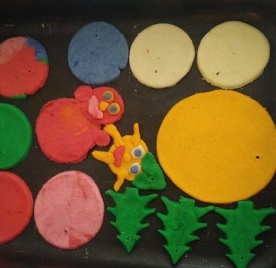 13:00 Завела им соленое тесто. На пару часов они притихли, а я занялась уборкой... а потом уборкой за ними. 15:30 Заготовки для елочных игрушек готовы. 16:00 Володя снова уснул, а мать не пошла готов