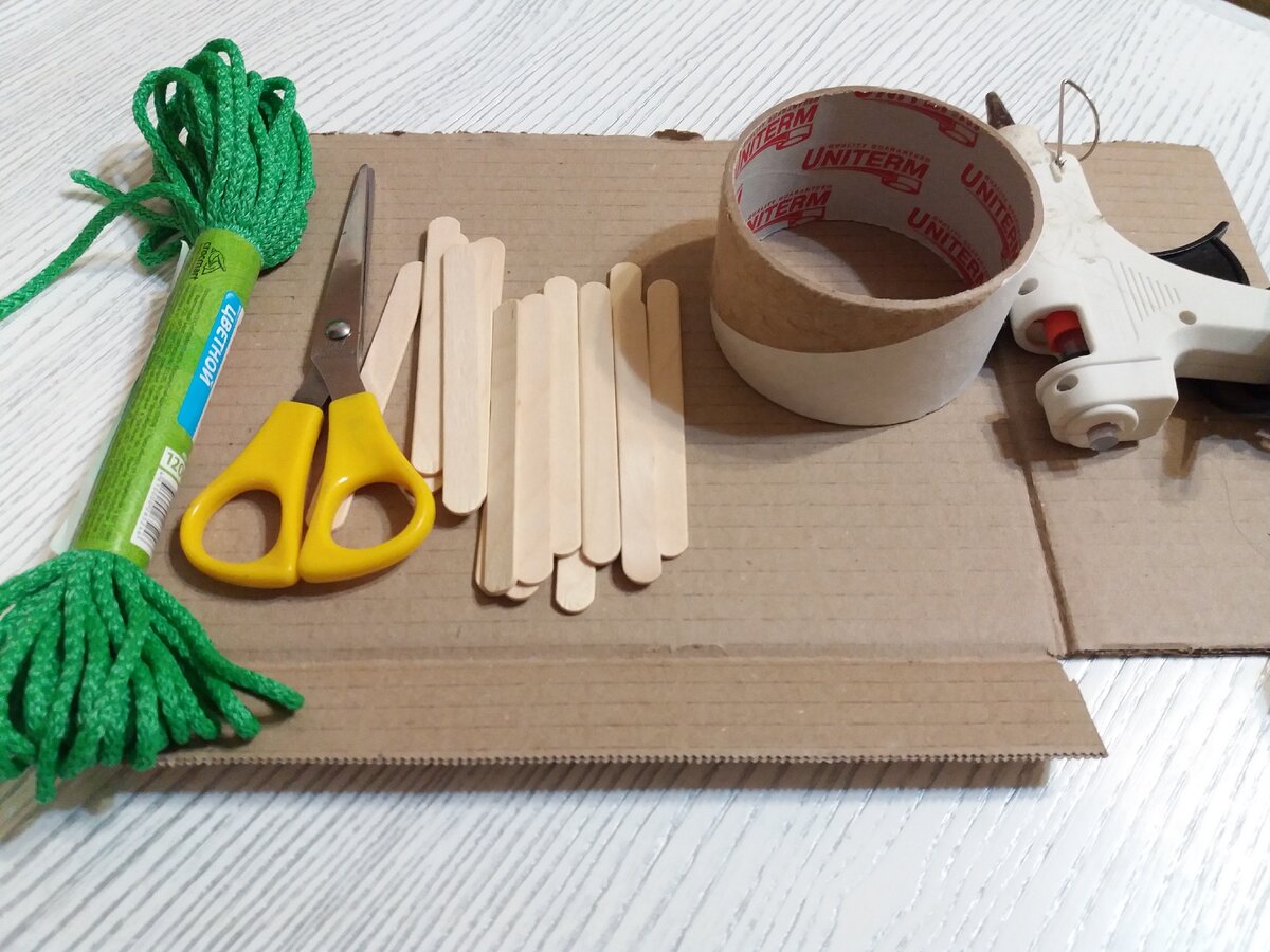 В очередной раз побывав в гостях у моей мамы я вдохновилась на очередную поделку самоделку)) Мне как раз нужна была такая) Правда делать пришлось сразу две и сейчас расскажу почему. Дело в том что когда моя работа была готова мне пришлось отдать её сестре, так она ей очень понравилась. И я сделала себе ещё одну) Я уже говорила что я очень люблю такие вот вещи которые не требуют большого времени на изготовление, а материалы для найдутся в каждом доме. Вот Вам как раз такой пример) Для работы я взяла: бельевую цветную веревку 2 шт по 10 метров палочки для мороженого бобину от скотча горячий клей ножницы картон дополнительно мне понадобился : плотный фетр 1 лист Вначале я обвожу бобину скотча на картоне и вырезаю её. Примеряю к бобине от скотча, края картона не должны выступать за её пределы. Это будущее дно моей поделки. Его нам нужно оформить. Для этого я капнула каплю клея на середину вырезанного картонного круга и начала заворачивать по спирали бельевую веревку. Иногда добавл