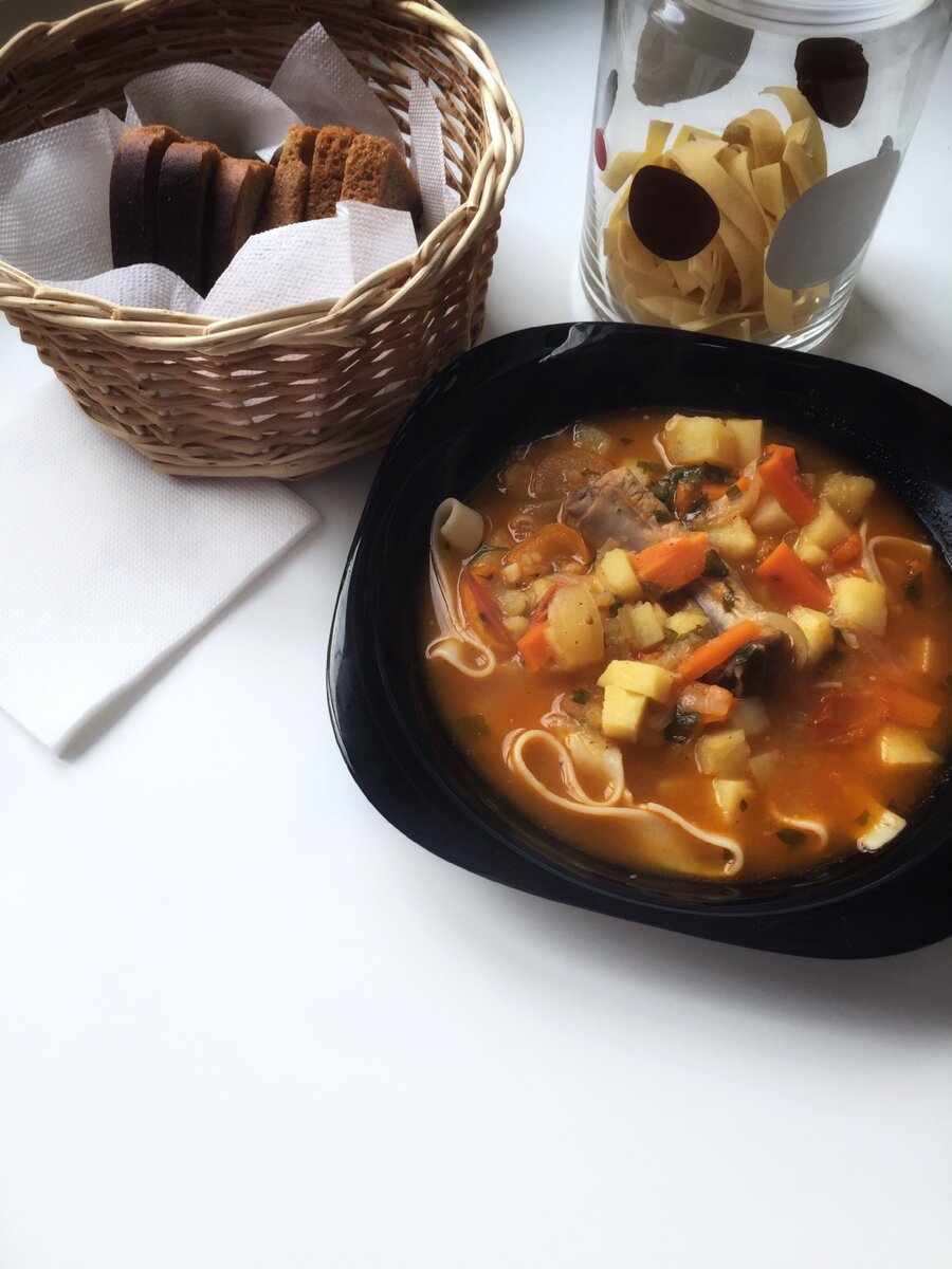 Лагман со свиными рёбрами Это очень вкусно 🤤 1 кг рёбер 1 луковица 1 помидор 1 болгарский перец 1 морковь 5 зубчиков чеснока петрушка 2 картофеля 2 ст. ложки томатной пасты соль, смесь перцев, хмели- сунели, красный острый перец. 100 грамм лапша для лагмана Промыть рёбра, порезать. Обжарить мясо в казане. Лук и помидор порезать полукольцами. Морковь и перец порезать соломкой. Добавить к мясу лук, морковь и обжарить. Далее добавляем болгарский перец и помидор. Солим, перчим, приправы и добавляем чеснок рубленый. Жарим все вместе минут 10. Добавляем томатную пасту и тушим. Заливаем горячей водой чтобы она покрыла все на 2-3 см. И варим на небольшом огне 40 минут. В конце добавляем петрушку. Отдельно варим лапшу. В тарелку сначала выкладываем лапшу, овощи и мясо и заливаем все бульоном. Приятного аппетита.